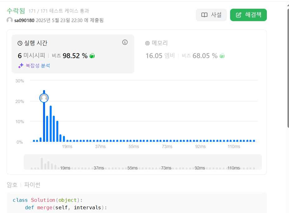 과연 될까? 생각해봤는데, n번째라고 가정했을 때, n-1번째 interval의 두 번째 성분과 n번째 시작 interval을 비교해야 interval이 병합되거나 병합되지 않을 때 merge list에 추가하여 다음 interval과 비교할 수 있게 된다.
