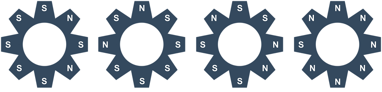 위와 같은 상태에서 1번 톱니바퀴를 시계 방향으로 회전시키면, 2번 톱니바퀴가 반시계 방향으로 회전하게 되고, 2번이 회전하기 때문에, 3번도 동시에 시계 방향으로 회전하게 된다. 4번은 3번이 회전하지만, 맞닿은 극이 같기 때문에 회전하지 않는다. 따라서, 아래와 같은 상태가 된다.